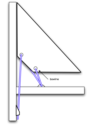 Instead, we use what we call a "floating tack." It's really quite simple, so I'll let the diagram explain it. It enables you to raise the mail all the way, and it pulls both the downhaul grommet and the tack grommet uniformly when you tighten the downhaul.